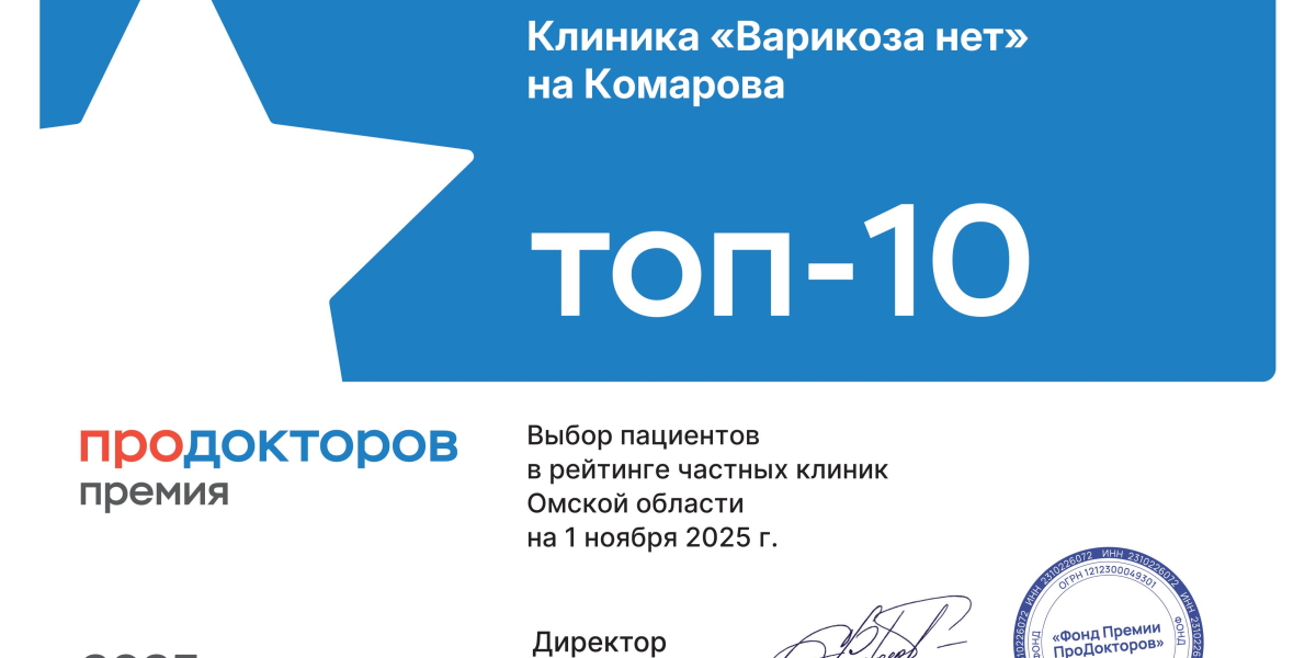 Каждый год «Фонд премии Продокторов» публикует рейтинг топ 10-частных клиник Омской области. В ноябре подведены итоги 2025 года. Мы очень рады снова быть в числе лучших!